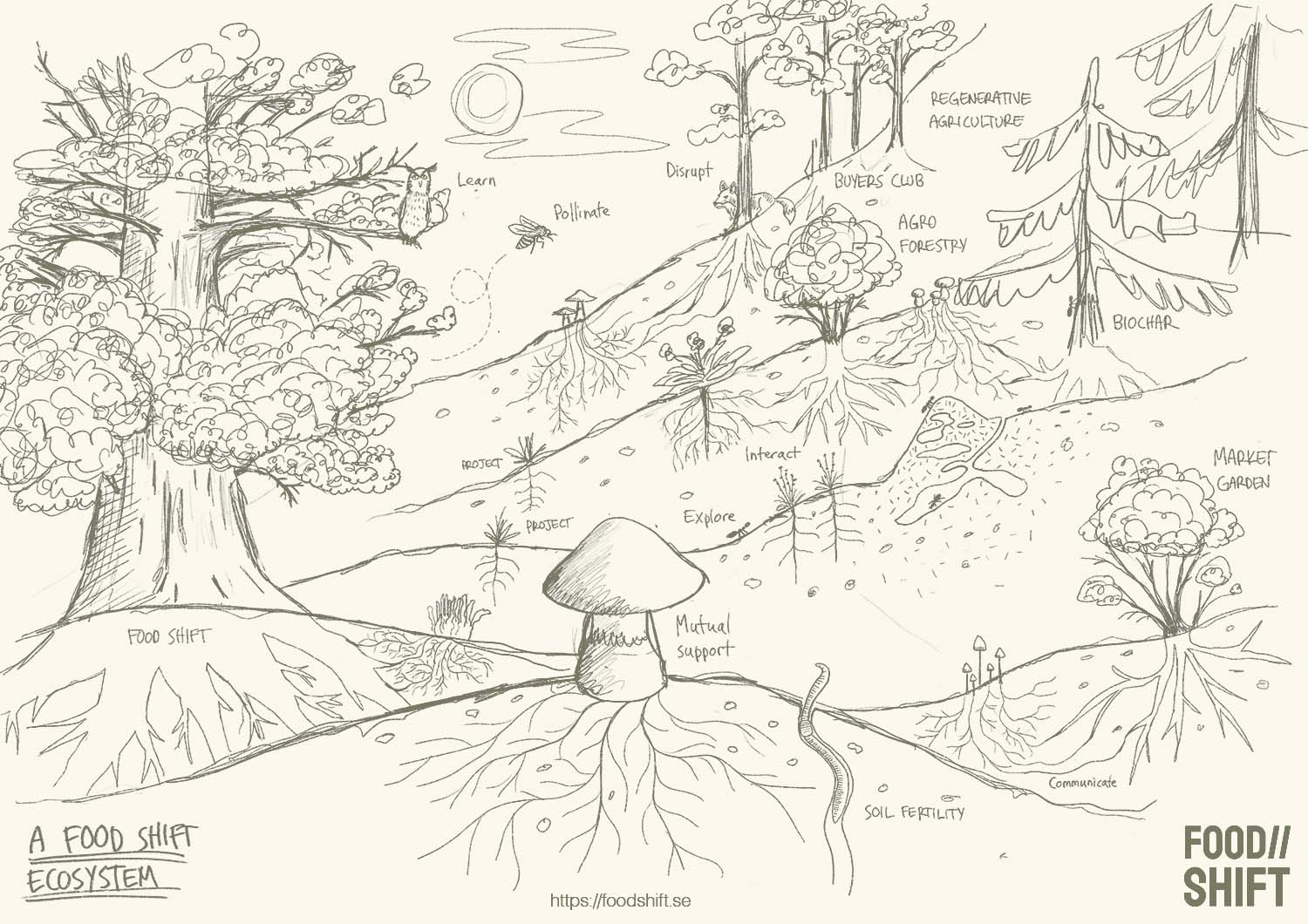 Food Shift is an open collective nourishing and connecting people, projects and organisations in emerging regenerative food systems. We believe that cutting down on carbon emissions doesn’t cut it. Doing less bad is not enough, we have to start making good!